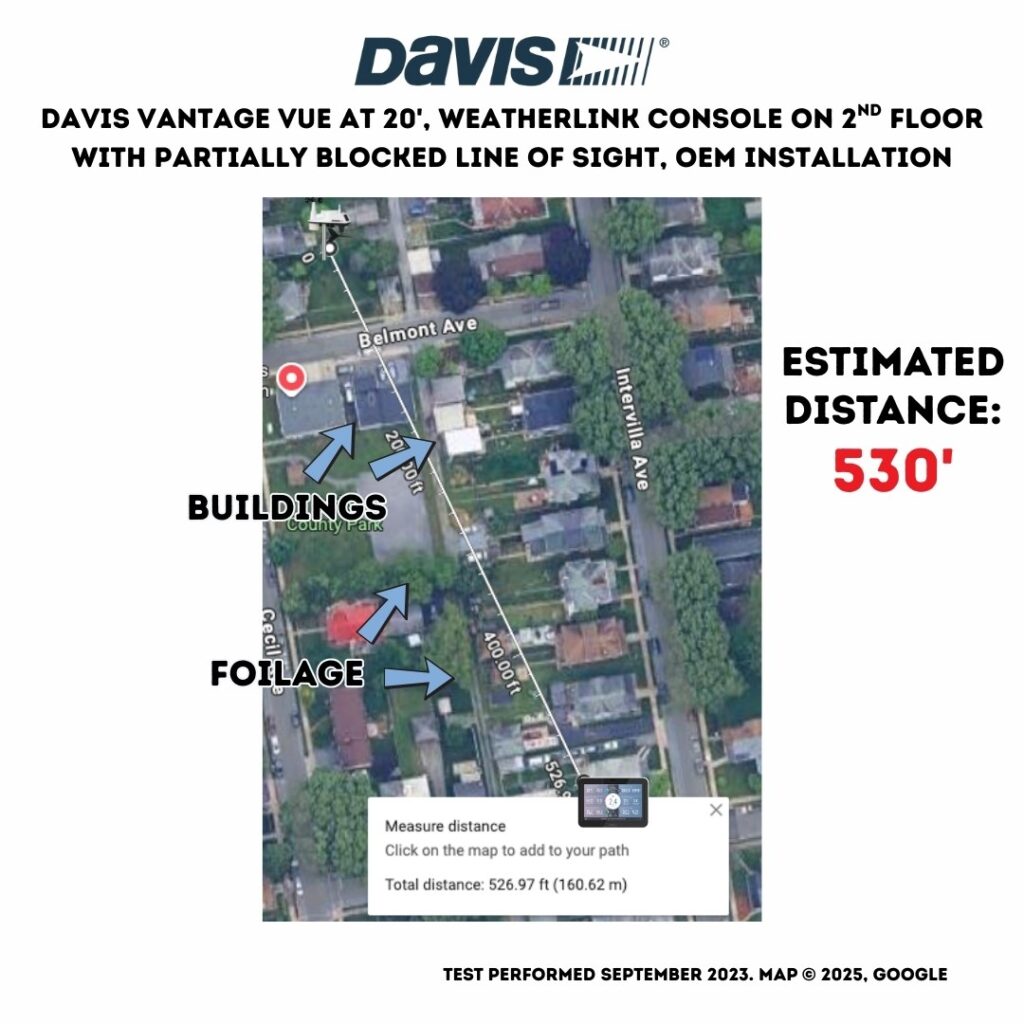 Yes, and surprisingly far in challenging situations. We’ve tested it! In September 2023, we moved from a home at one corner of the block to basically another. For a period of time, our Vantage Vue was mounted about 20′ off the ground at our old home, approximately 530 feet away to the northwest. Placing our WeatherLink Console in the second floor of the rear of our new home, we were able to receive data from the Vue, although with some packet loss. But here’s the thing – we were passing through quite a few obstructions along the way (see the map below). With a Yagi antenna, we’d have had no problem at all receiving reliable data.