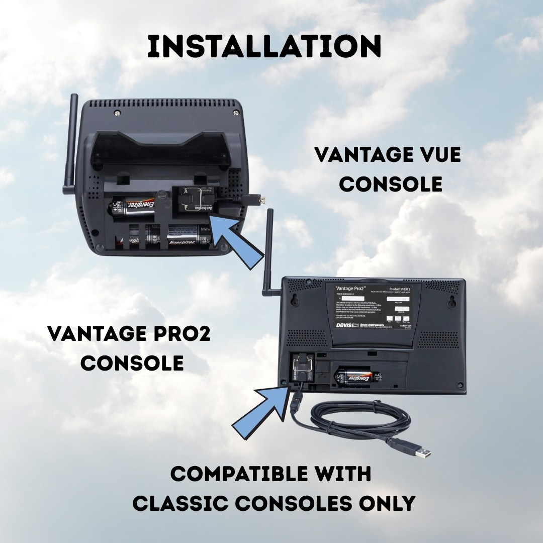 The Davis WeatherLink USB Data Logger fits neatly into the weather station console or Weather Envoy, storing weather data even when not connected to your PC, or Davis’ classic Vantage Vue or Vantage Pro2 consoles. Davis’s free WeatherLink software lets you see current conditions at a glance on the instant weather bulletin, create reports, and track weather conditions over time. You can also connect to Davis’ modern WeatherLink Cloud platform.