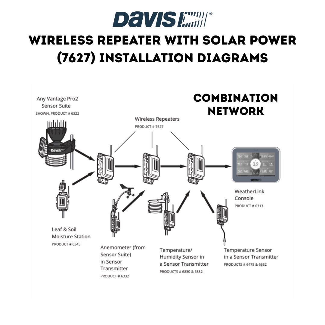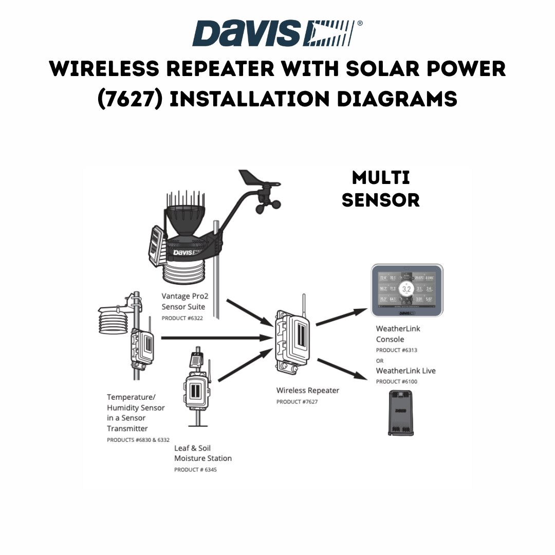 Use up to eight repeaters with a single wireless station, or form a network of weather stations by linking eight repeaters to eight different wireless stations. Multiple sensors can connect to a single wireless repeater (see images for examples).