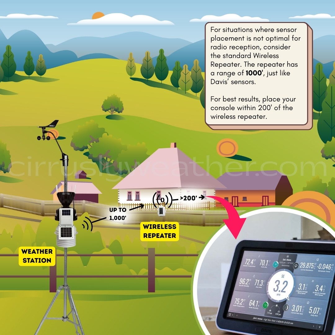 For longer distances or to improve reception in challenging areas, consider adding the Davis Wireless Repeater with Solar Power. The transmitting and receiving range for each repeater is up to 1000′ (300 meters) outdoors, line of sight; the typical range through walls under most conditions is 200′ to 400′ (60 to 120 meters). Includes solar panel, regulator circuit, and rechargeable battery.