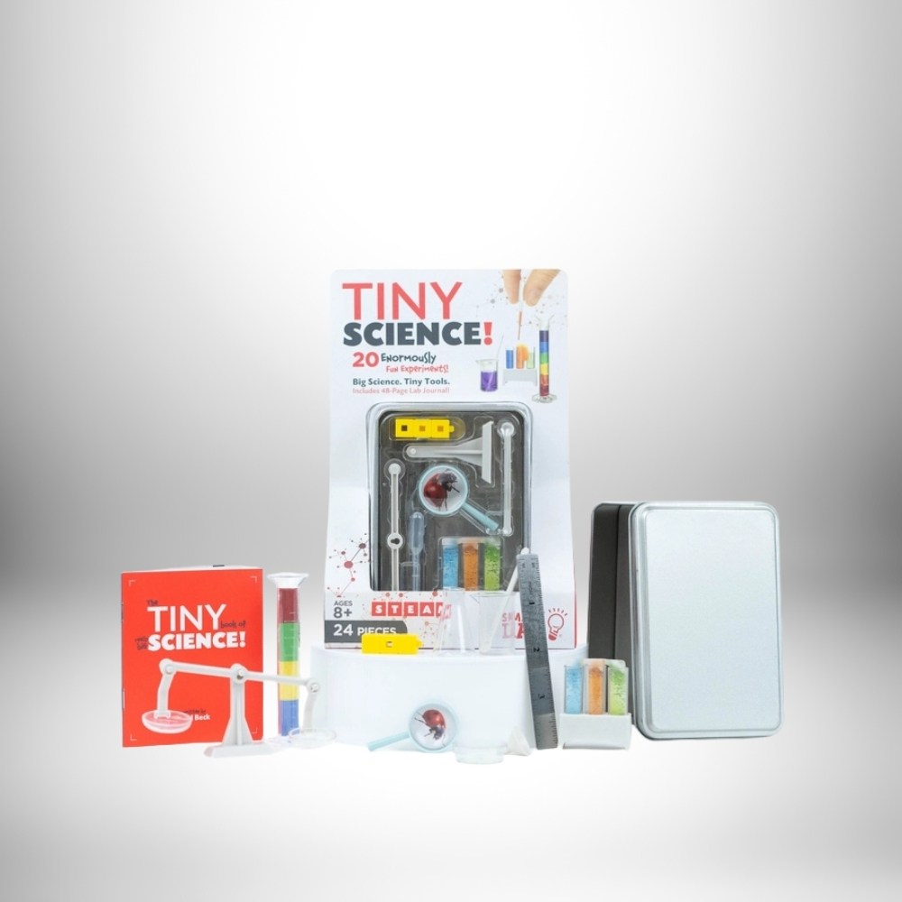 Tiny Science is a 24-piece miniature science lab featuring precision instruments tucked inside a compact storage tin.