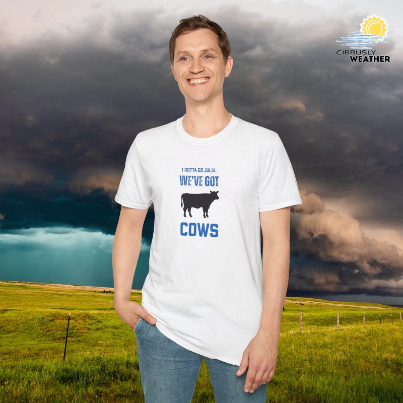Julia, she’s gotta go. Our white We’ve Got Cows Unisex T-Shirt is a play on that famous quote from 1996’s Twister. On that next chase, don’t leave home without it.