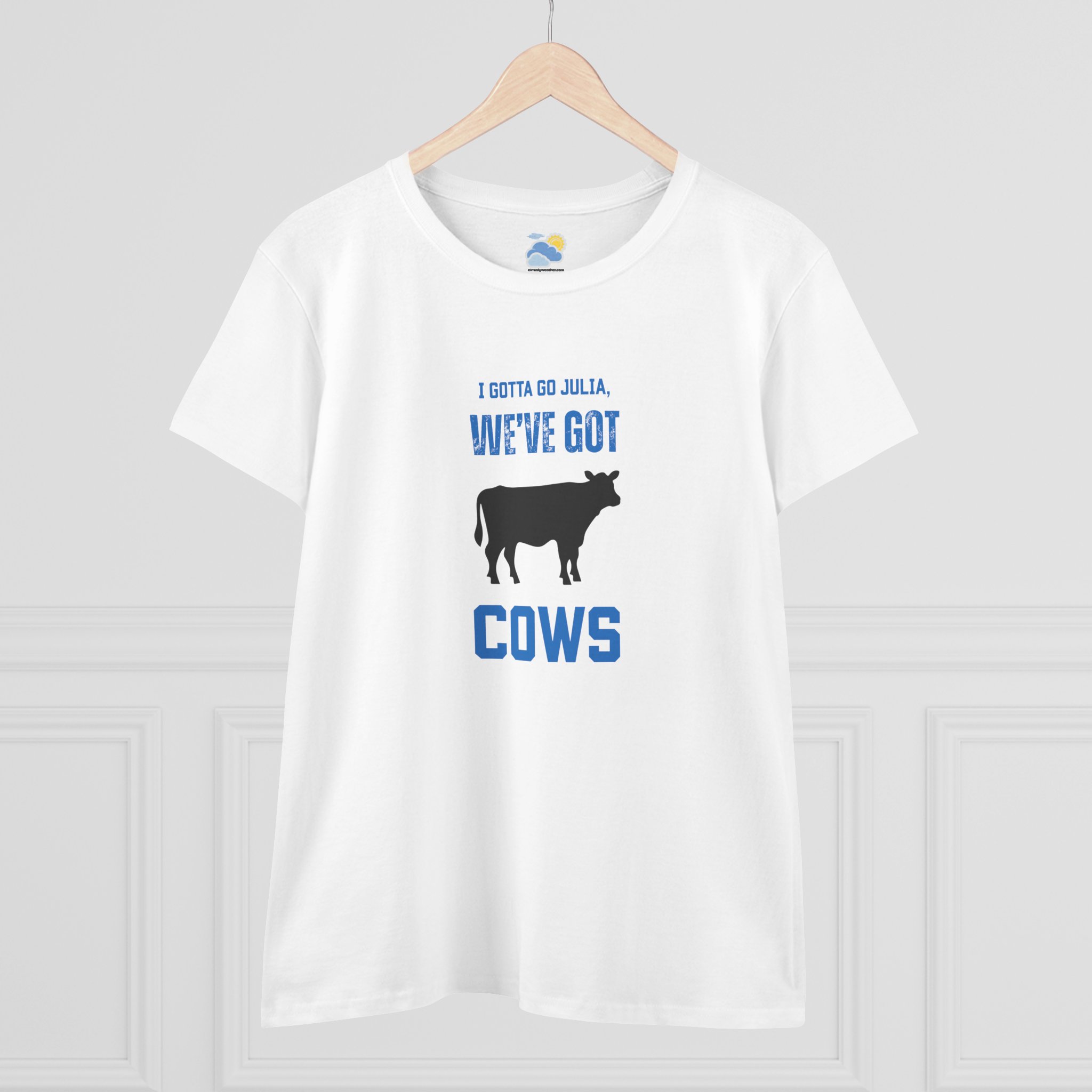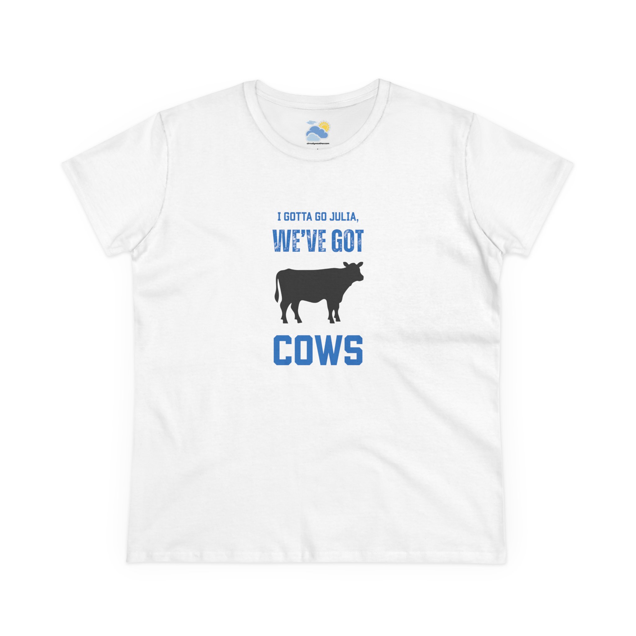 Julia, she’s gotta go. Our white We’ve Got Cows Women’s T-Shirt is a play on that famous quote from 1996’s Twister. On that next chase, don’t leave home without it. Made from soft, breathable fabrics, its relaxed fit allows for easy movement, making it a versatile addition to any wardrobe (and showing off your love for severe weather). Great conversation starter on that next chase road trip!